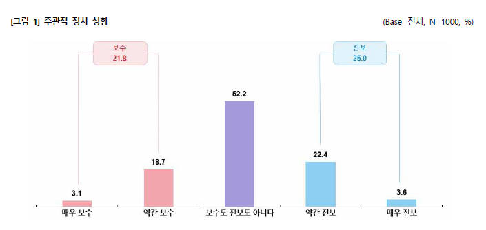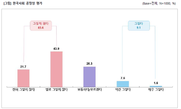 굳이 성향을 나눠본다면 보수 성향(21.8%)보다는 진보 성향(26%)이 조금 더 비중이 높다고 볼 수 있다. 이것은 앞에서 언급한 것처럼 '종교적인 보수성'과도 관련이 있다. 기독 청년들은 오히려 정치 영역에서 뭔가 획기적인 변화가 일어나거나 한국사회의 변화가 정치의 영역에서 촉발될 것이라는 기대가 현저히 낮다. 이것은 한국 사회의 공정성을 평가하는 청년들의 답변에서도 확인할 수 있다.